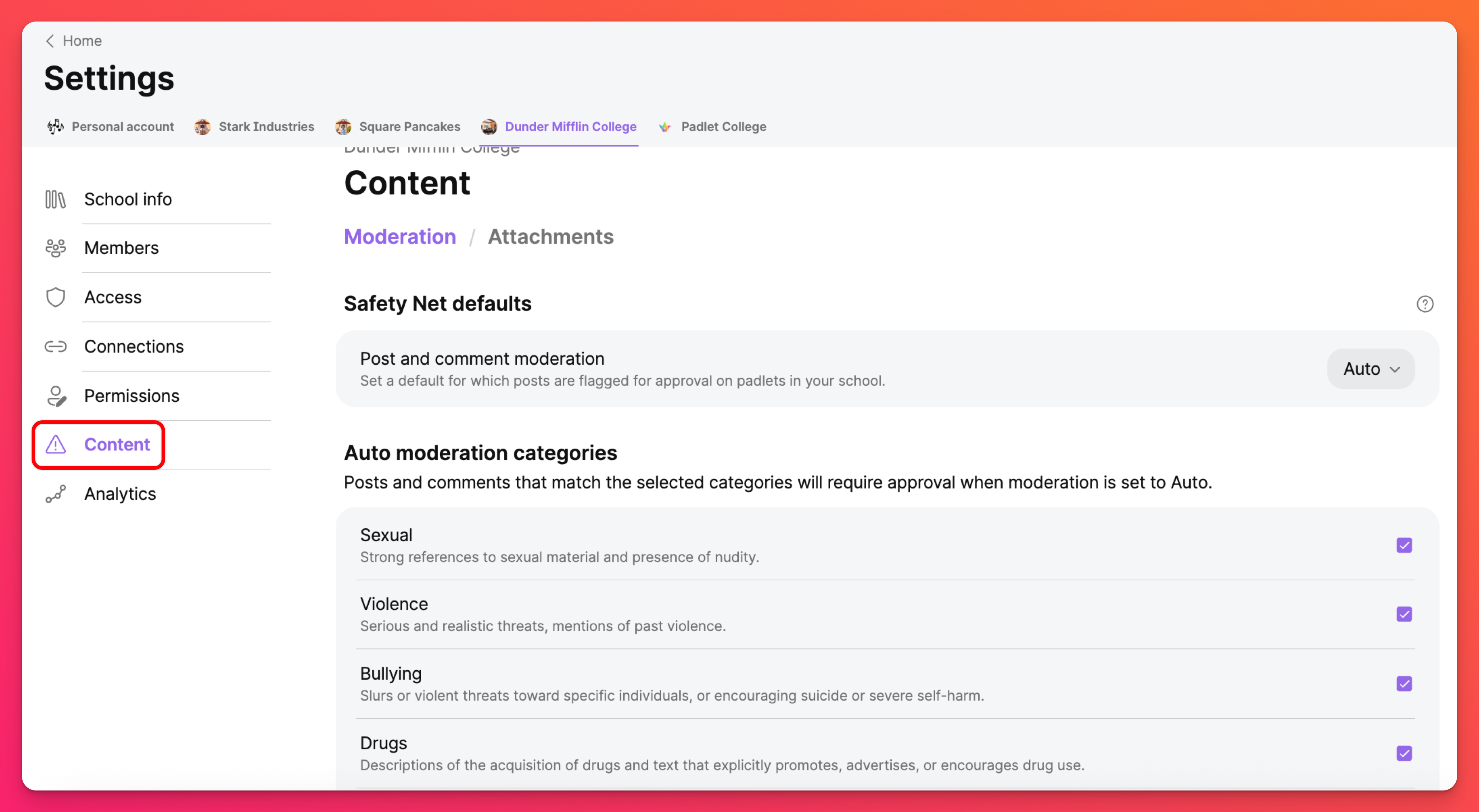 Ovládajte spôsob, akým študenti a učitelia používajú účet, úpravou nastavení oprávnení. Prispôsobenie Oprávnení vám umožní určiť, či študenti môžu v rámci účtu vytvárať padlety a ktoré nastavenia ochrany osobných údajov sú im k dispozícii. Môžete tiež vybrať, či môžu komunikovať s účtami mimo školy.