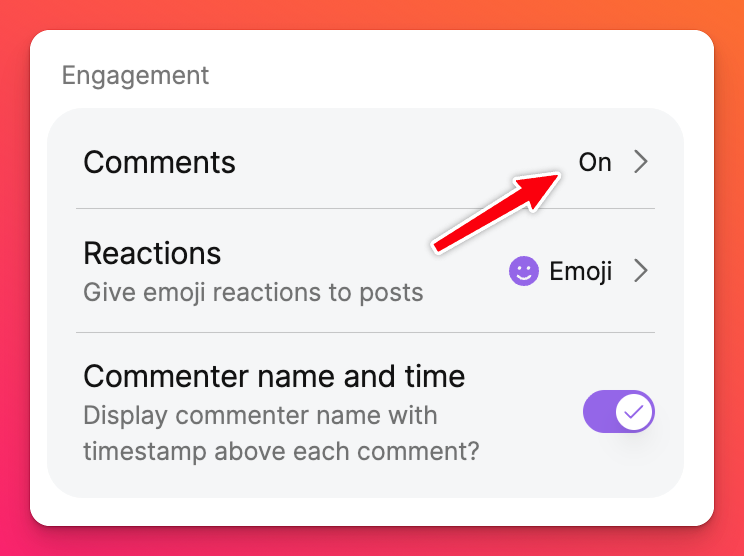 Če želite omogočiti komentarje, odprite ploščo z nastavitvami svoje oglasne deske tako, da kliknete ikono z zobnikom za nastavitve (⚙️) in preidete na možnosti za sodelovanje. Kliknite Komentarji in preklopite gumb VKLJUČITE poleg možnosti Omogoči nove komentarje.