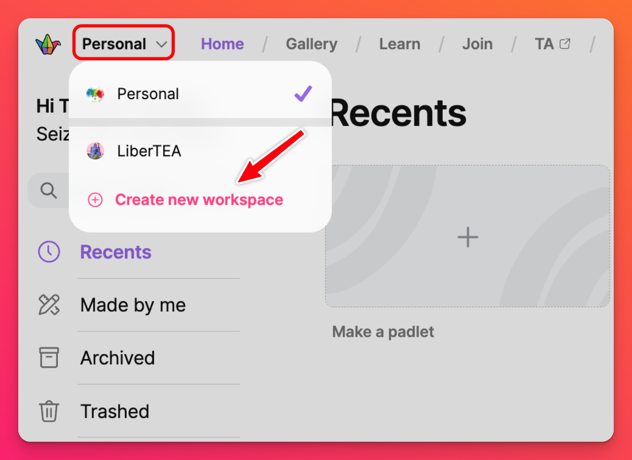 När du först loggar in på ditt konto kan det hända att du först ser instrumentpanelen i din personliga arbetsyta. För att komma åt instrumentpanelen i din teamarbetsyta klickar du på din kontomeny längst upp till vänster på sidan. Klicka sedan på din Team-arbetsyta.