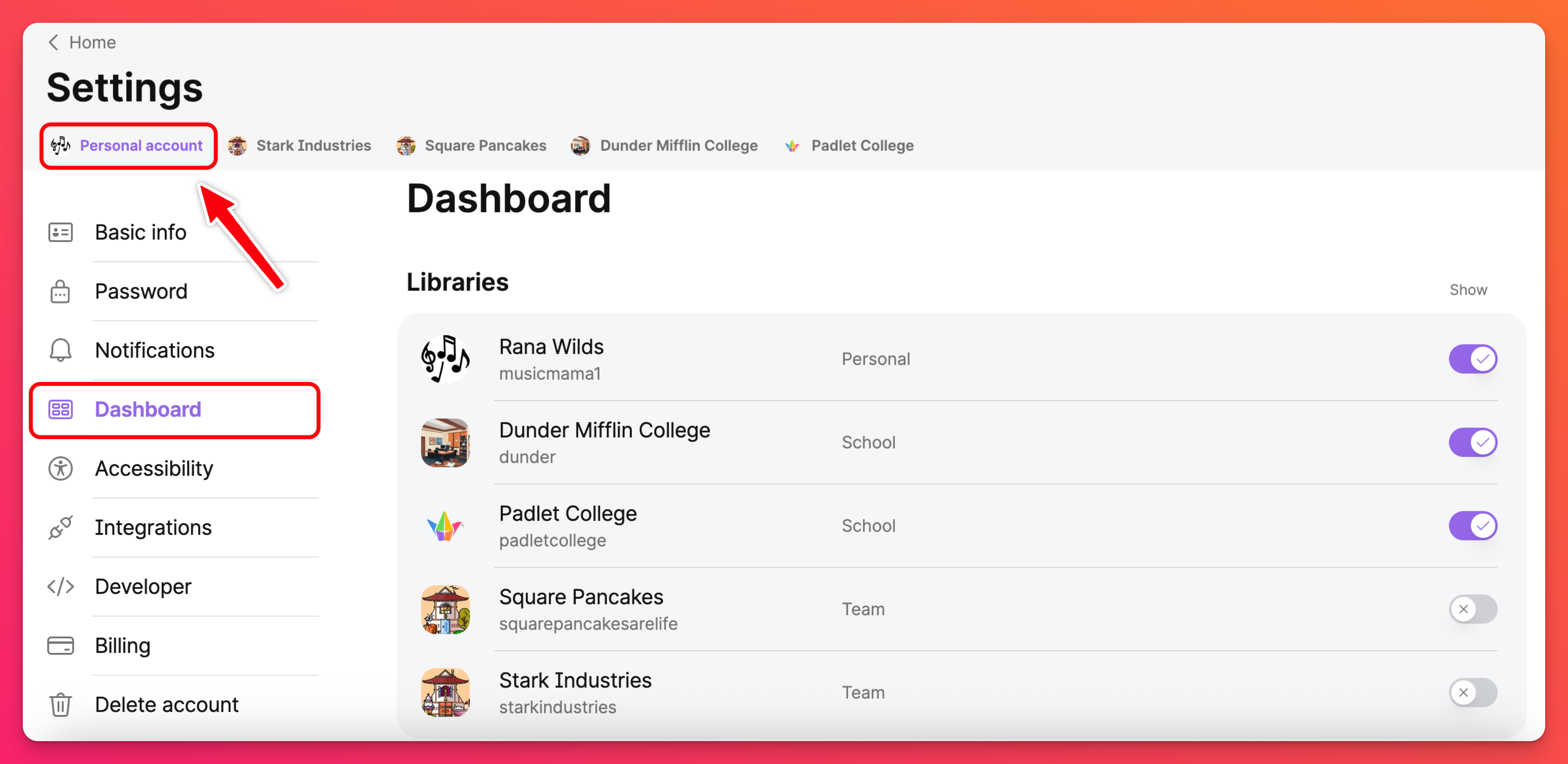 - På sidan Inställningar väljer du ditt personliga konto ( högst upp) och sedan Instrumentpanelen (till vänster).